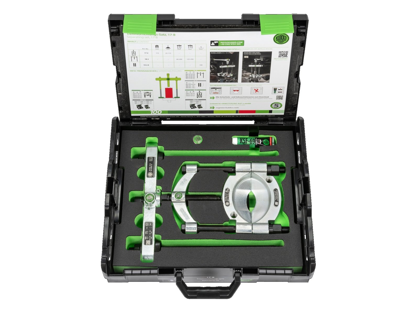 Das 4-teilige Separator-Set 17-B dient zum Ausziehen von Kugellagern, Wälzlagern, Innenringen und anderen Flachteilen in Handwerk, Industrie und Werkstätten, wenn der Platz für einen Abzieherhaken nicht ausreicht. Der Separator trennt die Teile schonend, bevor sie von außen abgezogen werden können. Im Vergleich zur Serie 15 ist die Serie 17 besonders handlich, da die Abzieherbeine mittels einer Druckspindel schnell und zentriert fixiert werden. Das 4-teilige Set enthält jeweils einen Separator und einen Abzieher sowie zwei Verlängerungen und deckt somit ein breites Anwendungsspektrum ab.