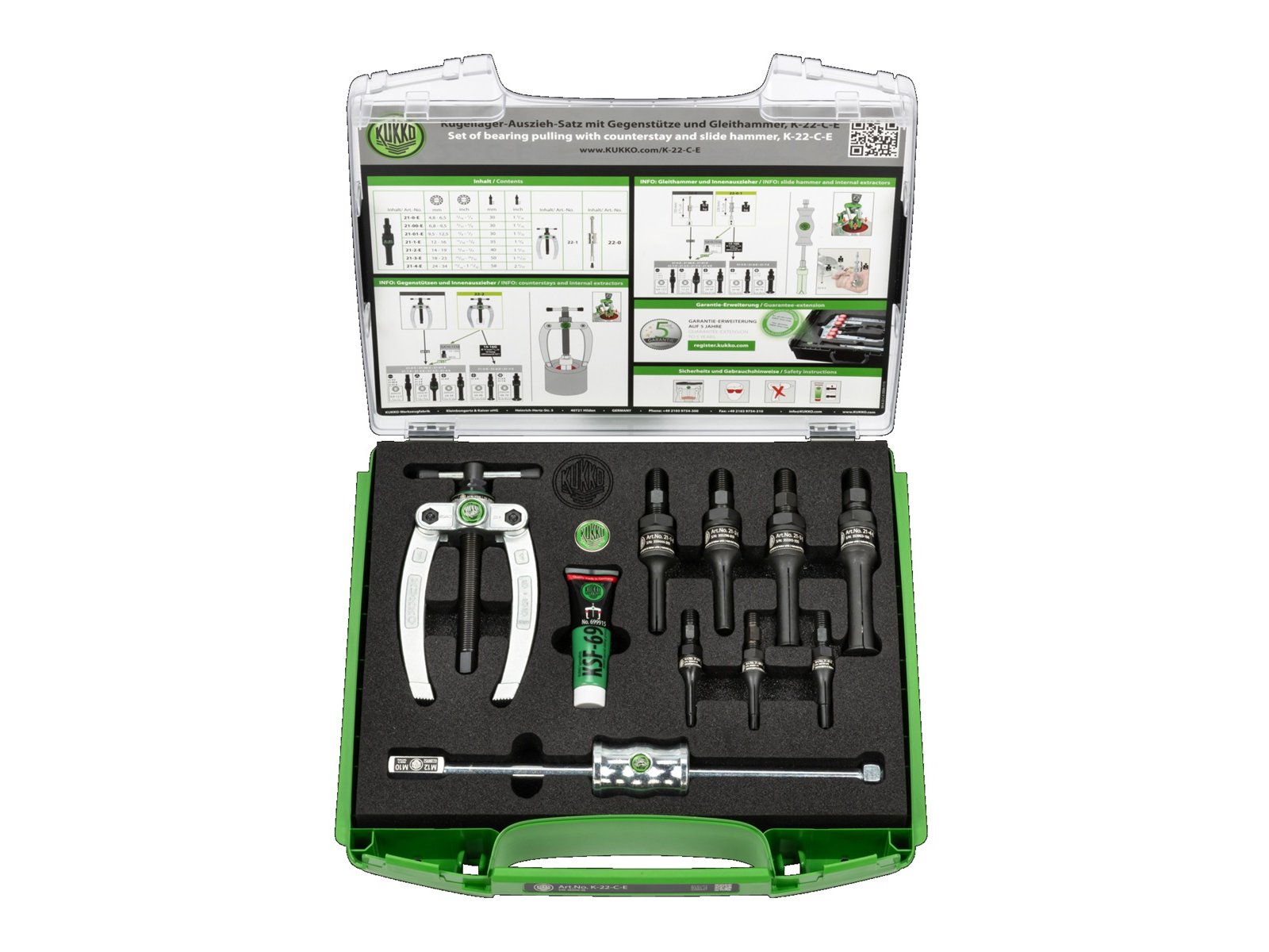 The 9-piece ball bearing puller set with counterweight and sliding hammer K-22-C-E is used for pulling out flush-mounted bearings, bearing outer rings and bushings in trades, workshops and industry. The segmented design with extra fine grip edges allows for safe pulling out of flush-mounted parts. The included counterweight or sliding hammer is used together with the internal pullers, depending on whether there is sufficient support surface.