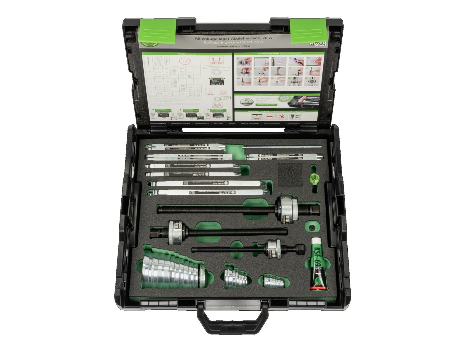 The 59-piece ball bearing puller set 70-A is used for the non-destructive removal of deep groove ball bearings without removing the shaft in trades, industry and workshops. With these pullers, bearings that are located both in a housing and on a shaft can be pulled off quickly and easily and, if they are not already damaged, can be reused. The 70 series impresses with its puller hooks specially developed for precise installation in bearing raceways, which enable the safe removal of small to large bearings.