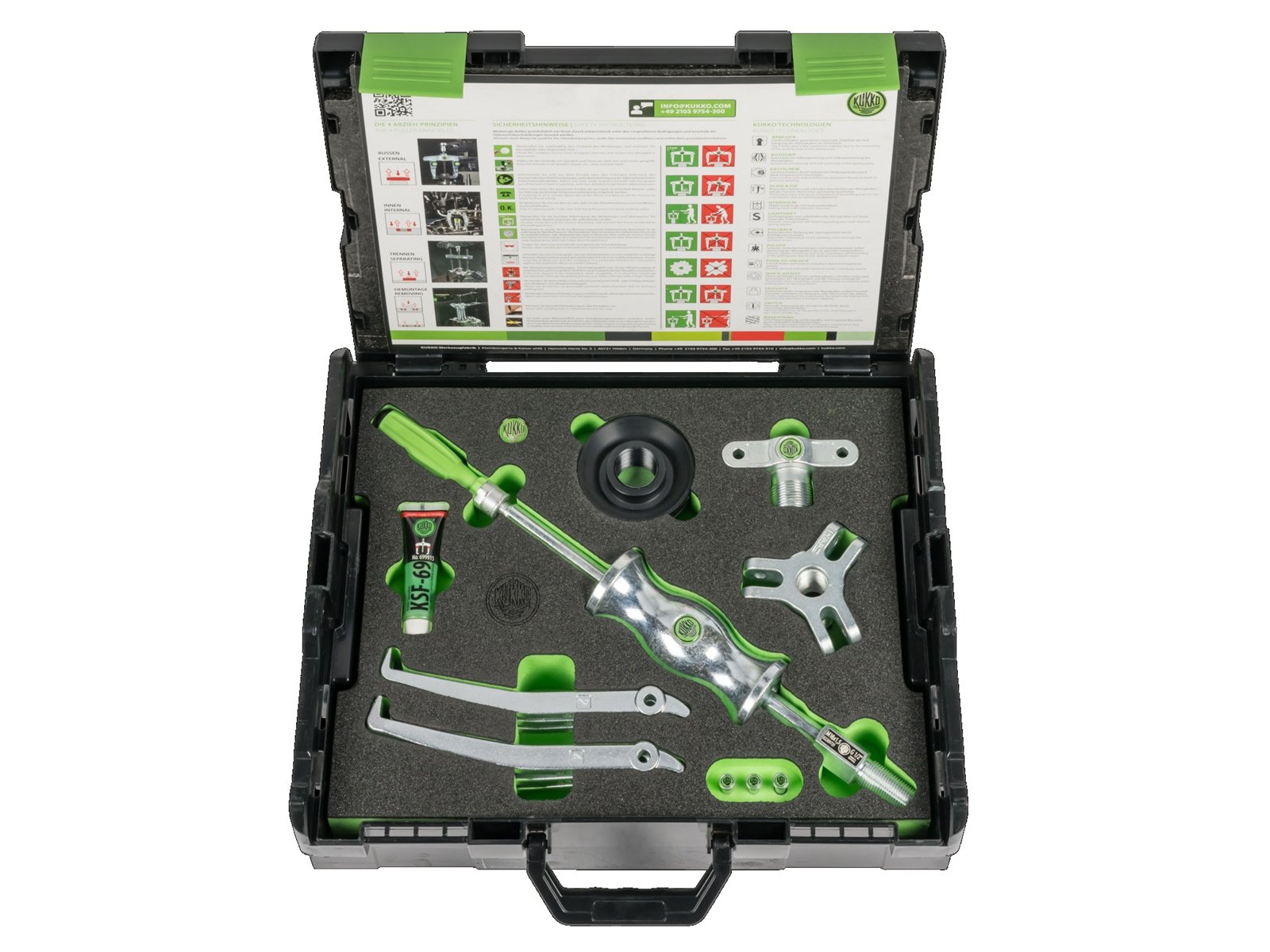 The 13-piece universal puller set with 2-jaw and 3-jaw Puller and sliding hammer is used for central Pulling of bearings, gears, and discs in all common sizes for trades, workshops, and industry. This allows any component that sits on a shaft and is freely accessible from the outside to be loosened. By tightening the clamping cone, the jaws are automatically centered. Operating the clamping cone allows the desired spread to be set. In addition, the jaws can be preloaded using the cone to prevent possible slipping. Usable both as an external Puller and as an internal extractor (in combination with a sliding hammer) by simply reversing the jaws and the clamping cone.